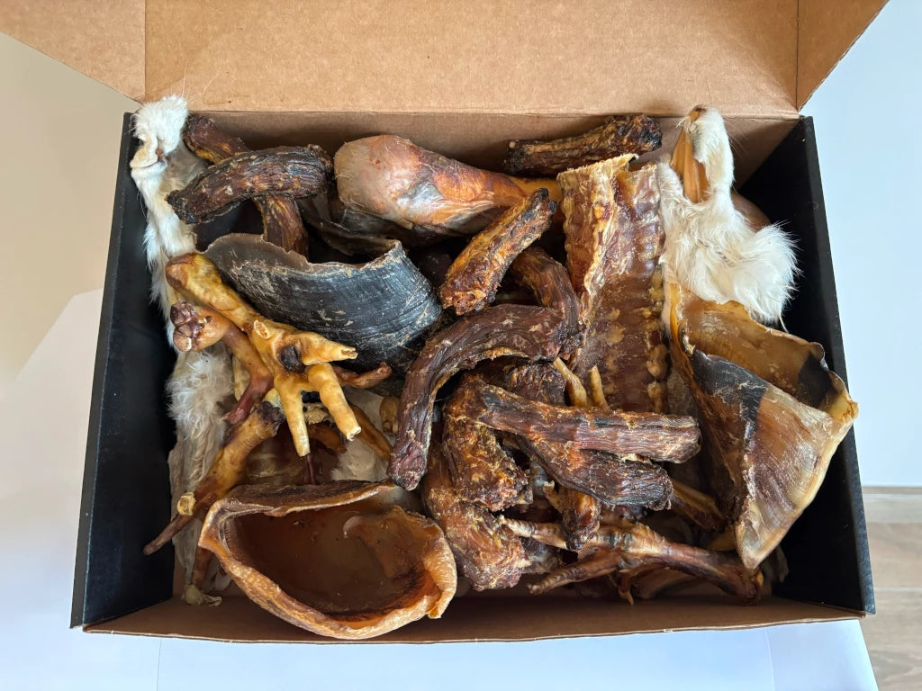 -150 g de patas de pollo: Crujientes y deliciosas, ricas en colágeno, ofrecen una masticación relajante que cuida las articulaciones.